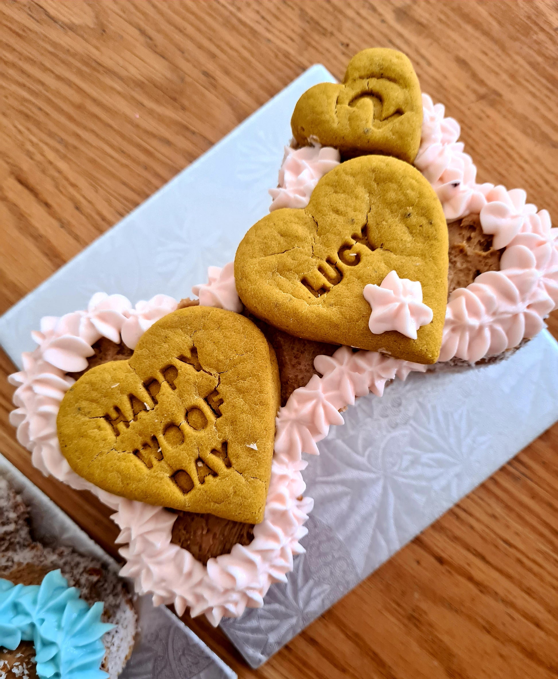 Please write the name of your dog/dogs on the notes section at checkout and we will email you to confirm the personalisation and decorations on the cake.