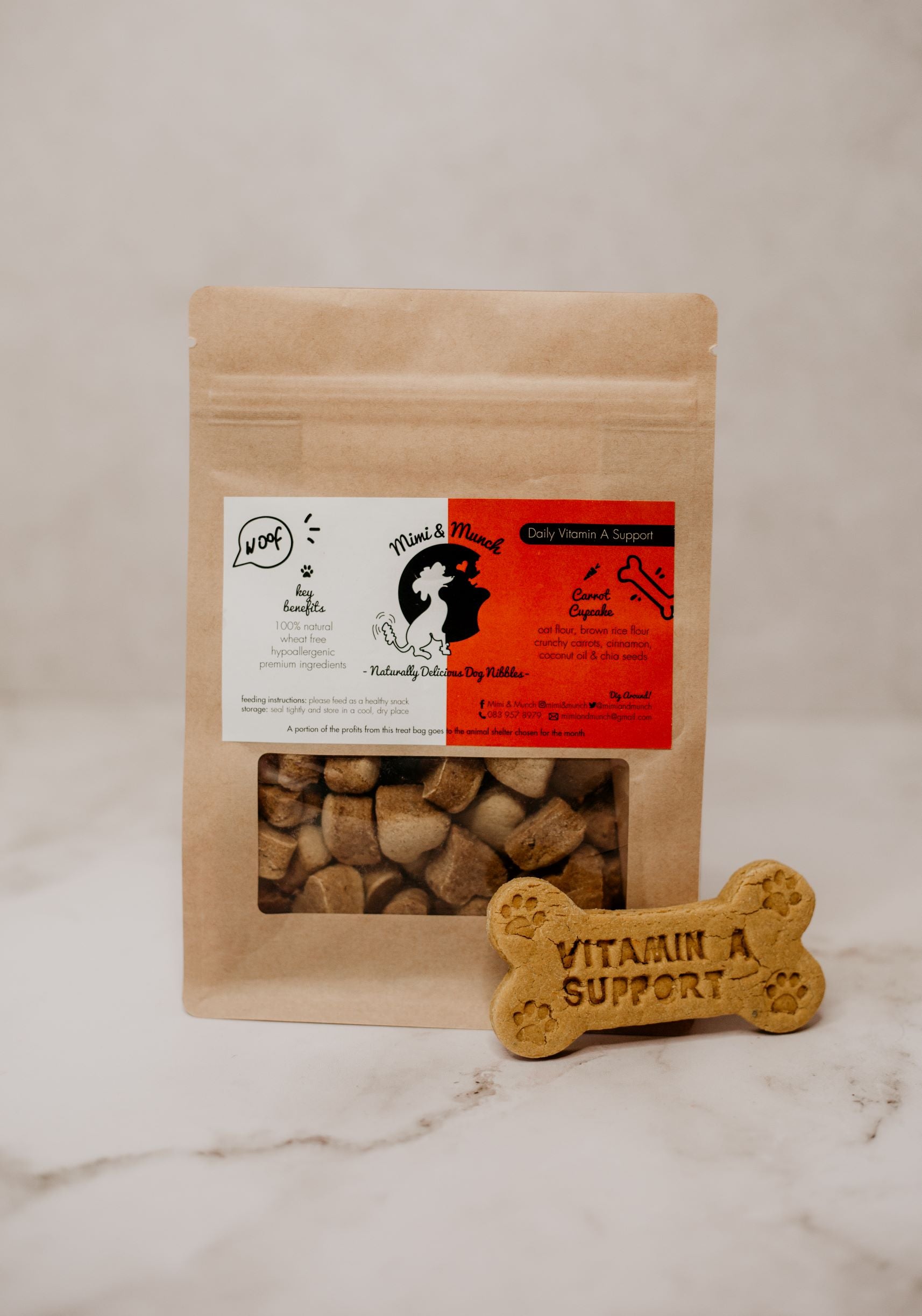 Ingredients: Oat Flour, Brown Rice Flour, Crunchy Carrots, Cinnamon and Coconut Oil (no salt, no sugar, no xylitol)