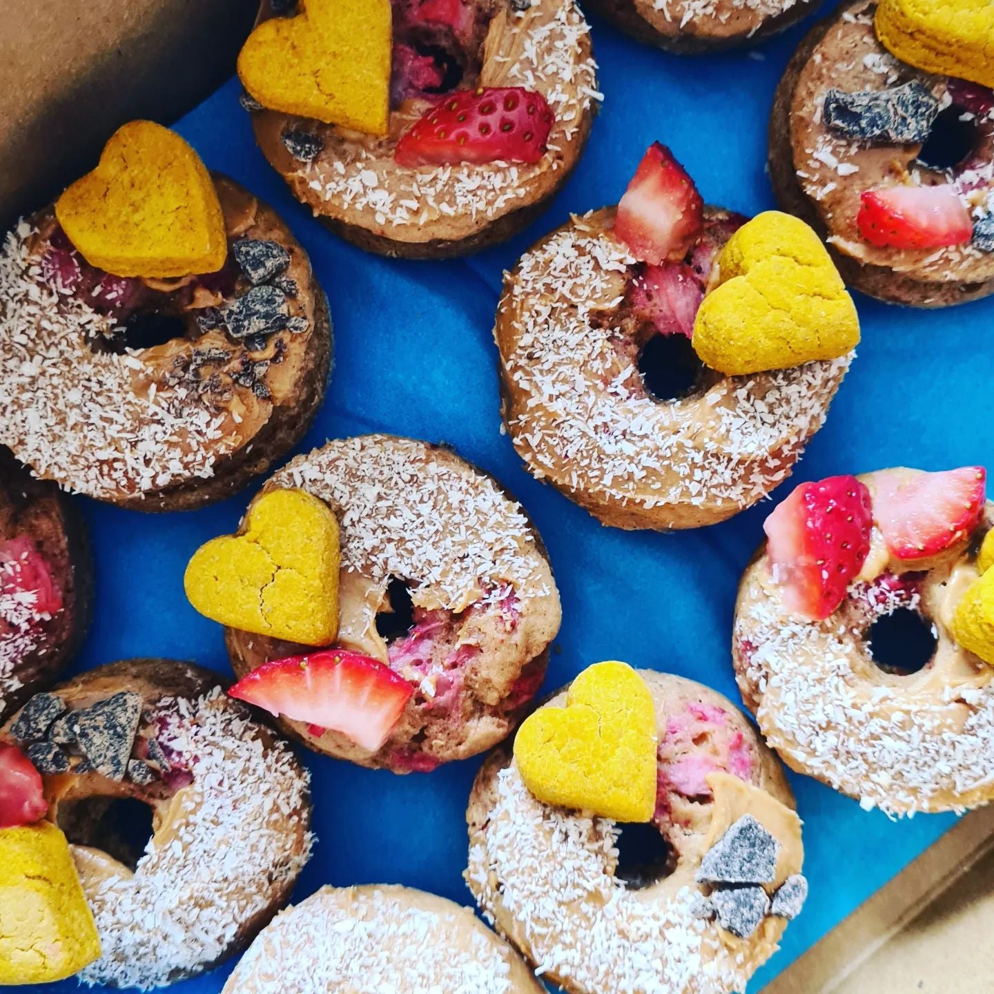 Peanut Butter, Berry and Banana: made with homemade peanut butter, fresh strawberry and banana and topped with coconut sprinkles, carob chips and a Mimi & Munch heart treat.