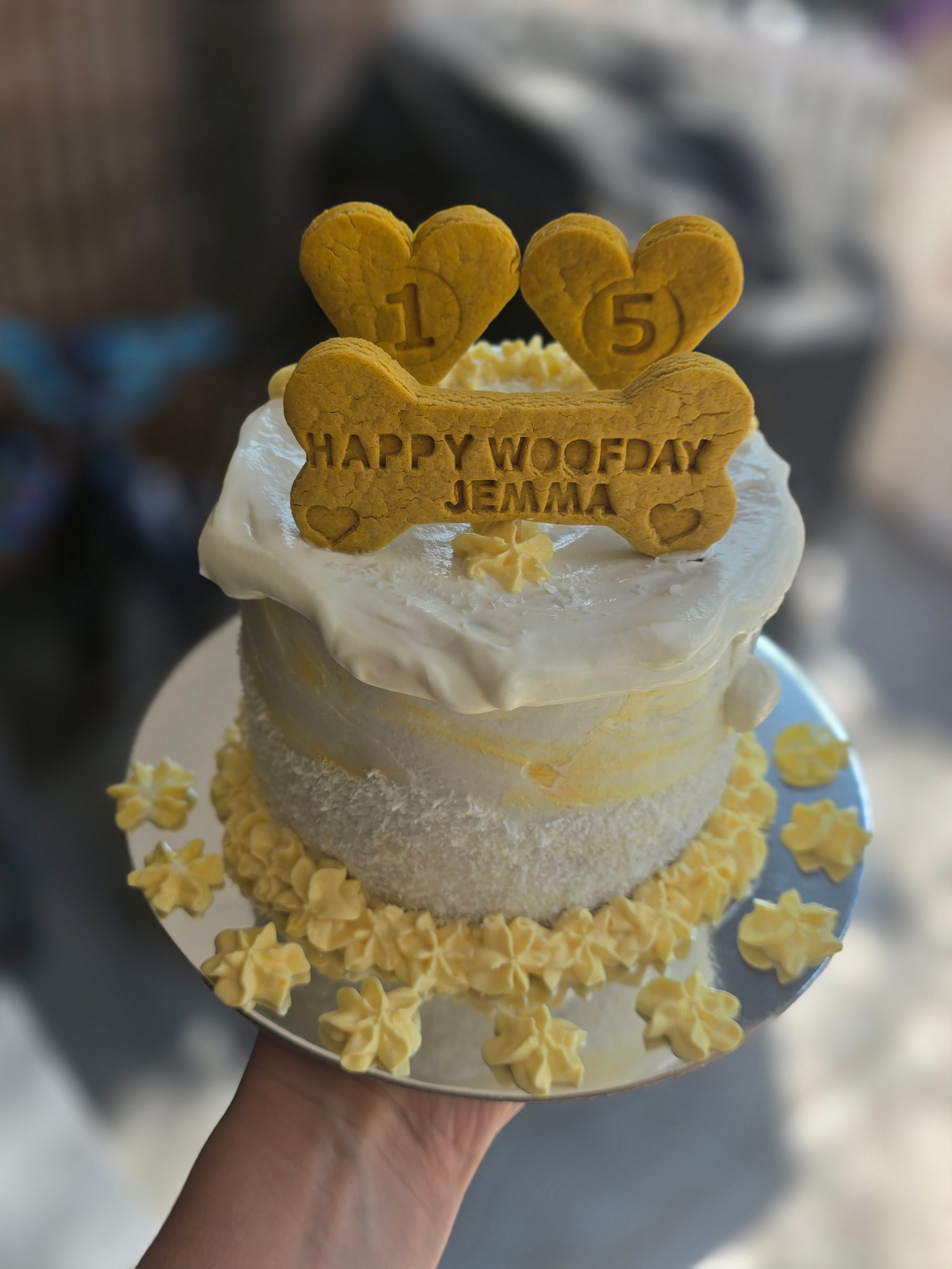 This cake was inspired by a beautiful dog named Leia. It is a delicious 4inch round cake with a drip organic yoghurt dog friendly icing and topped with treats, pompoms and coconut sprinkles!
