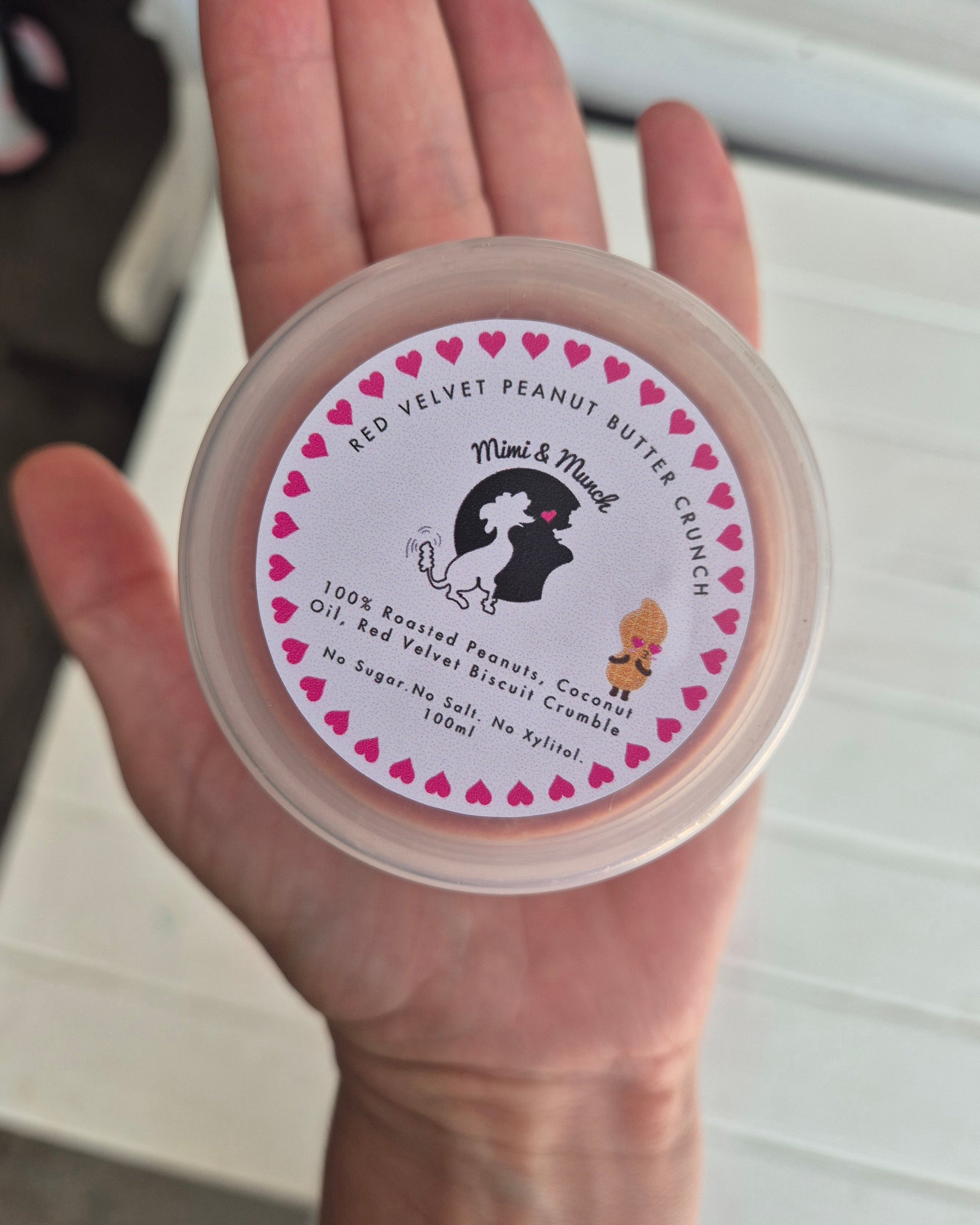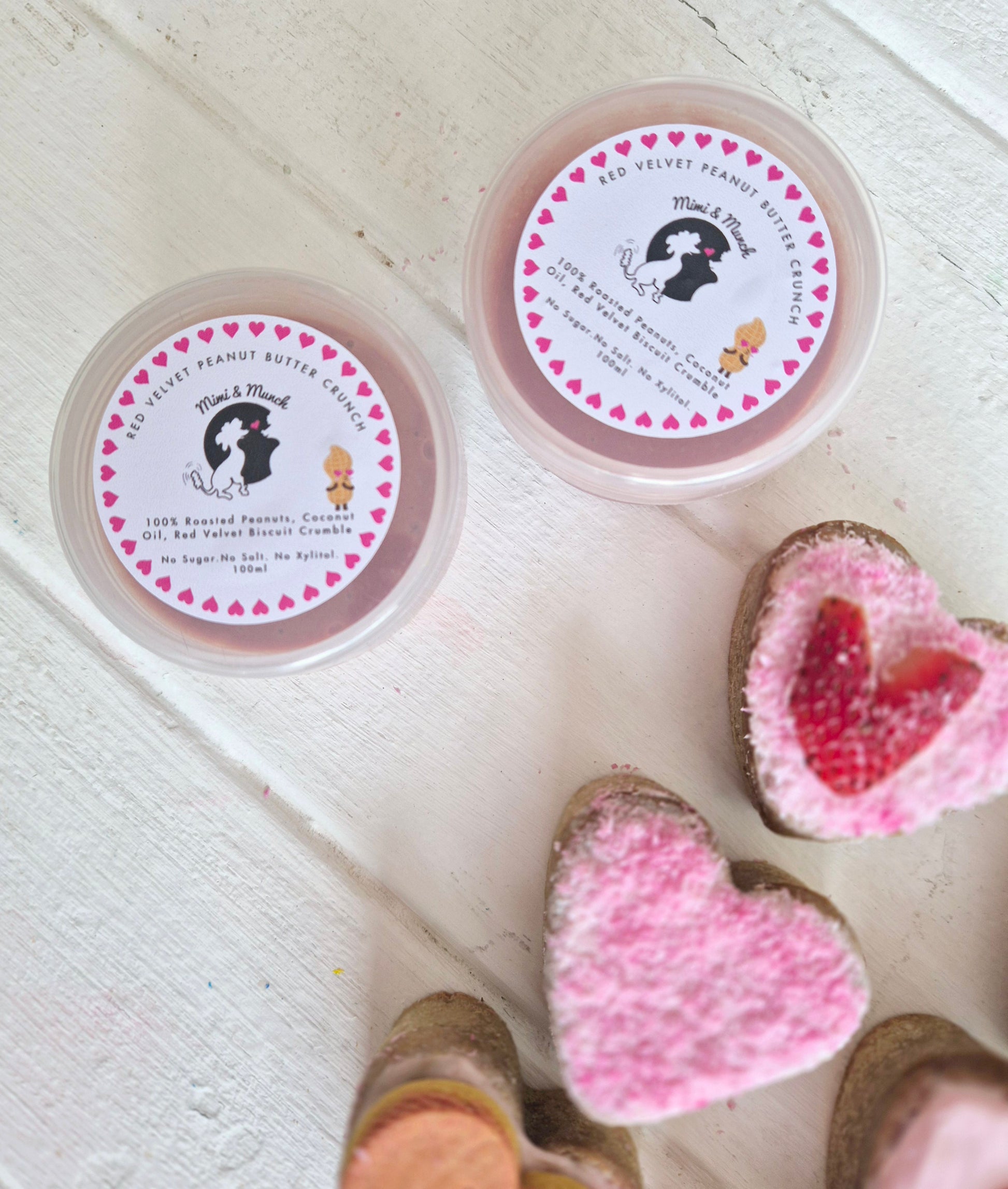 Made with 100% Roasted Peanuts, Organic Coconut Oil and filled with Mimi & Munch Hypoallergenic, Wheat Free Red Velvet Biscuit Crumbles. ❤️