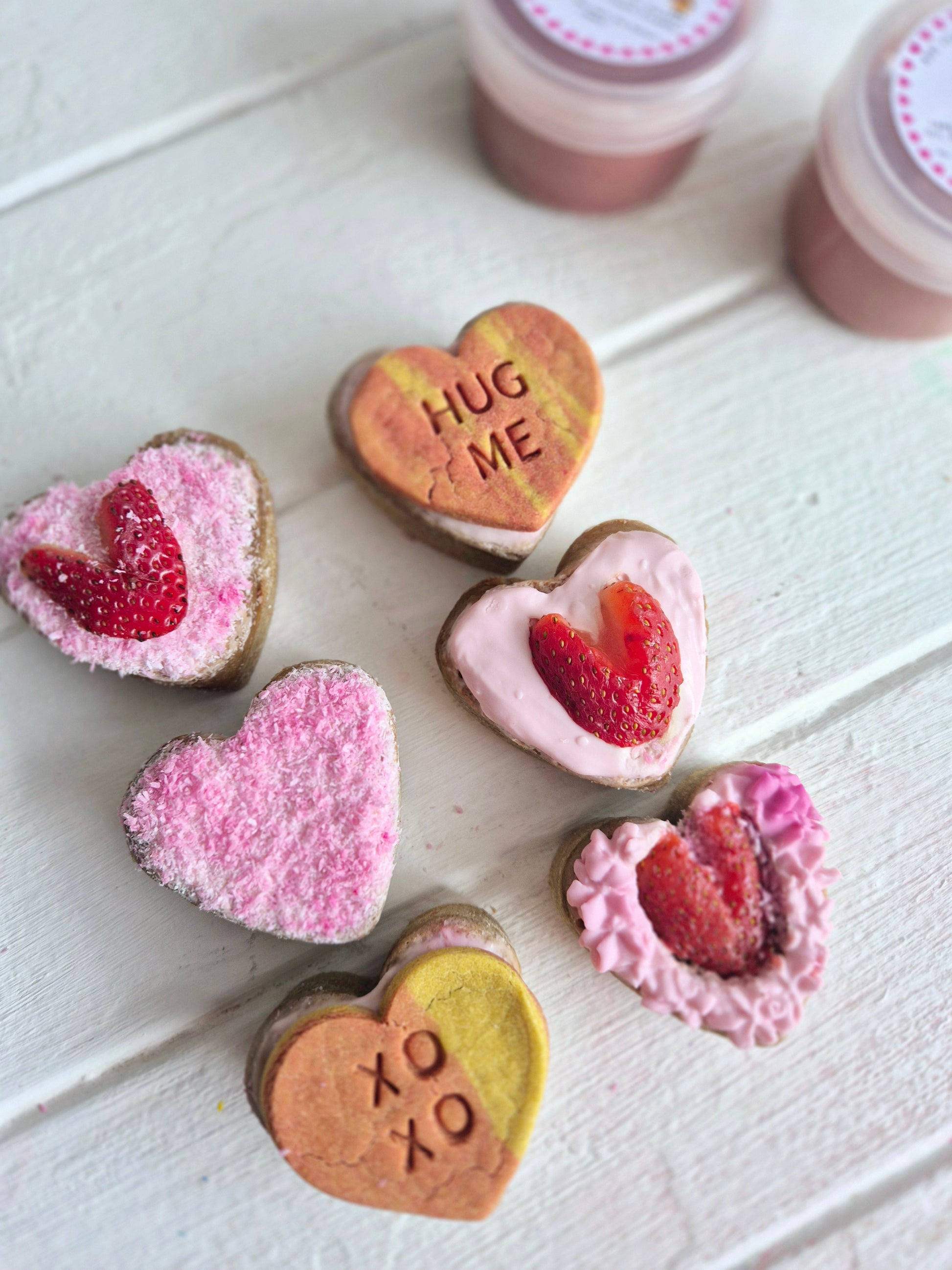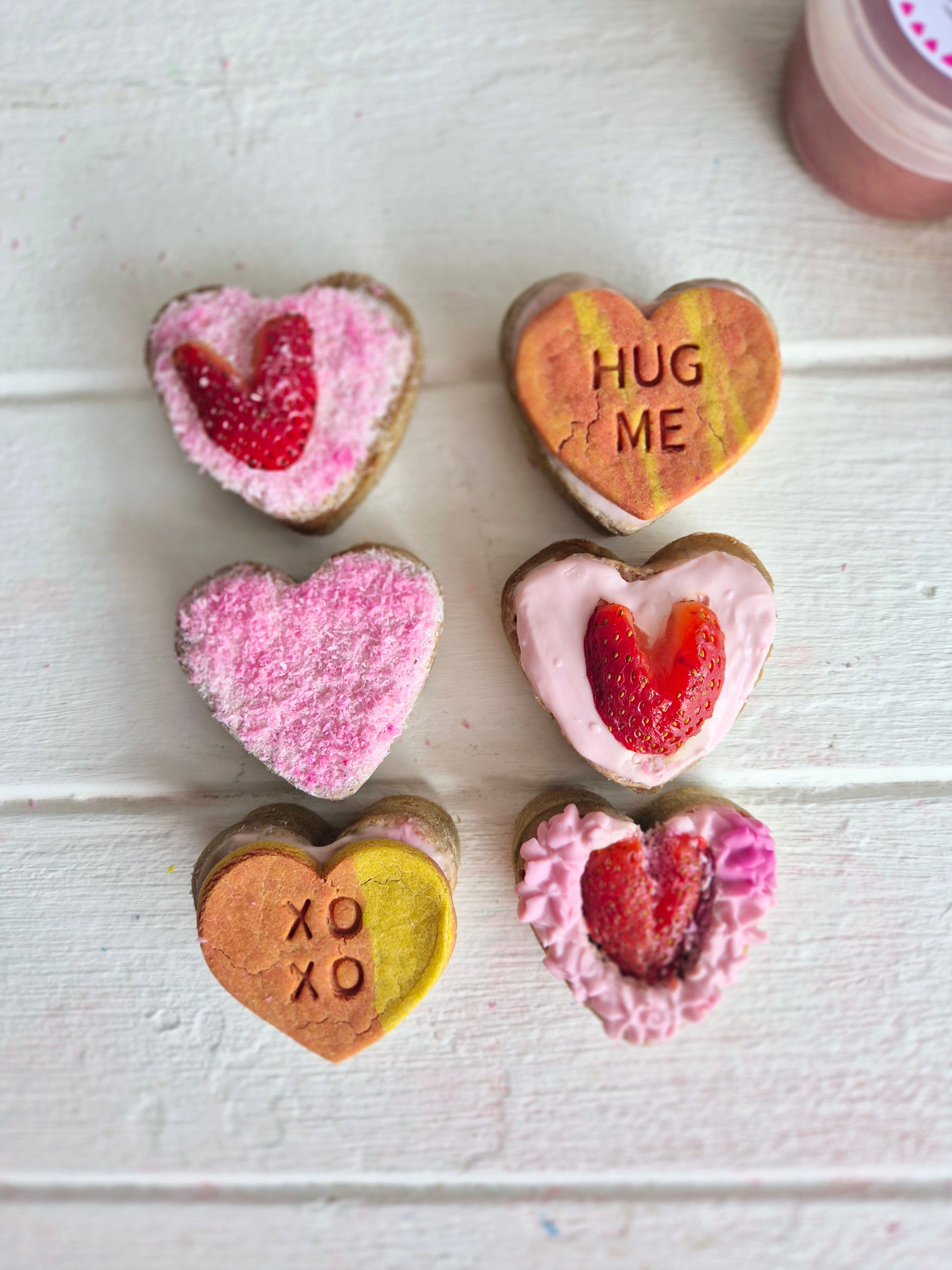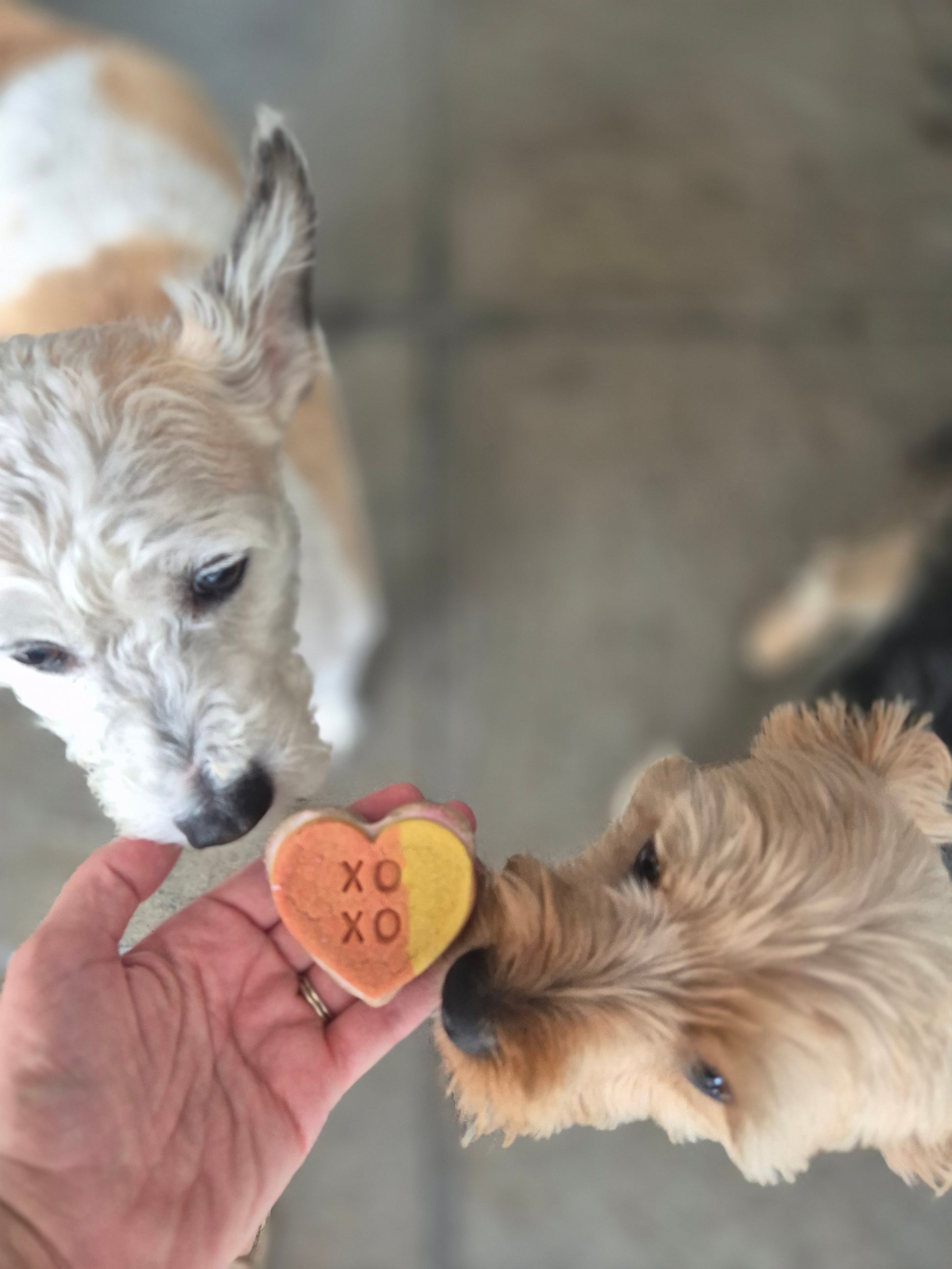 2 pupcakes adorned with Valentines Bark Hearts and an option for a custom cookie with your furbabies name too ❤️